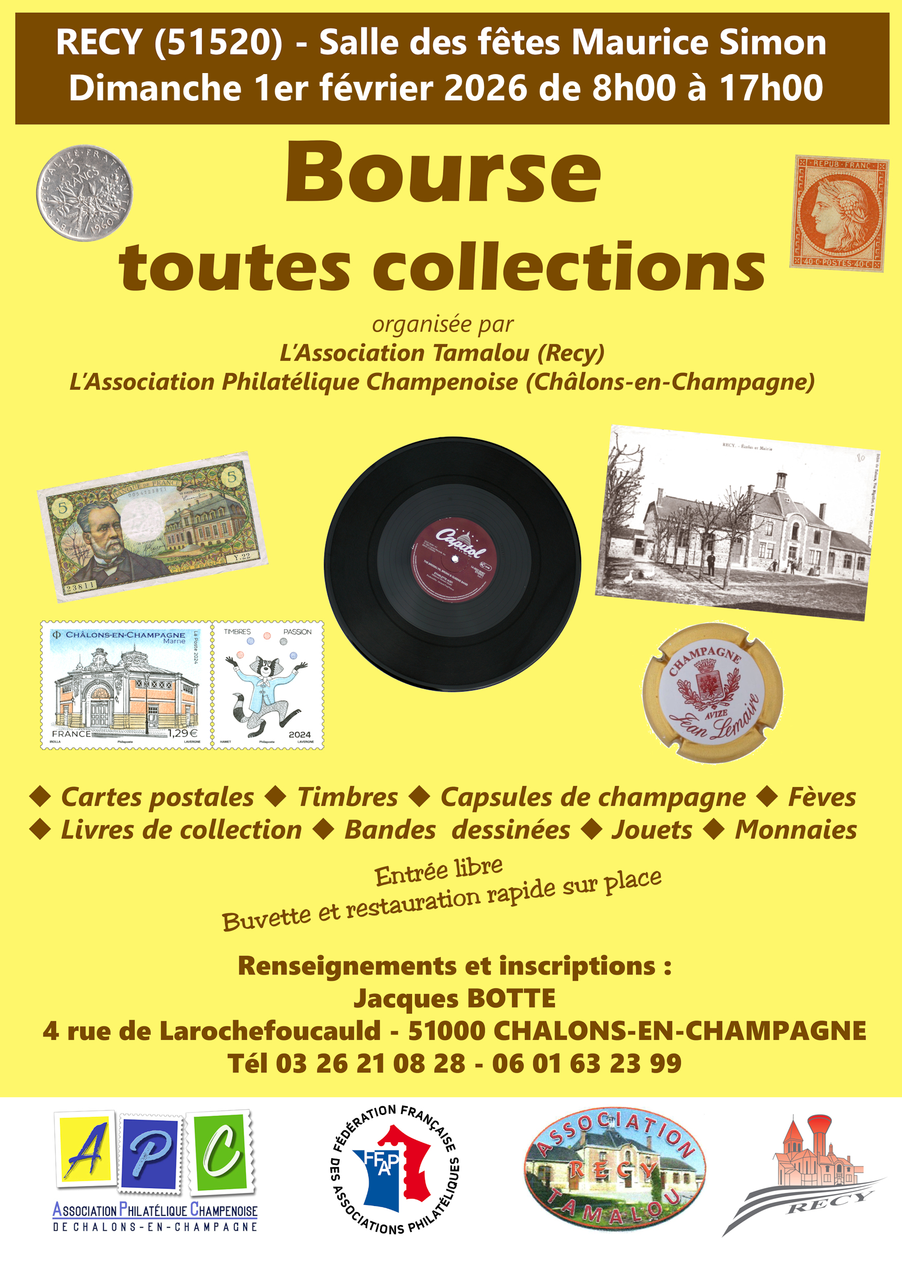 L’Association Philatélique Champenoise et l’Association Tamalou de Recy organisent leur 4ème bourse toutes collections.