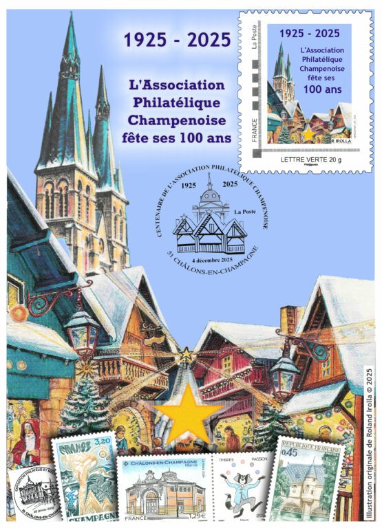 L’Association Philatélique Champenoise est née le dimanche 15 février 1925, au 1er étage d’un café de la rue de Marne à Châlons-sur-Marne. Pour commémorer cet évènement, l’APC a organisé une exposition temporaire avec édition d’une carte postale, un IDTimbre et une oblitération temporaire. Ce souvenir restera le dernier réalisé par notre ami et membre de l’association Roland IROLLA, disparu le 3 octobre 2025. Les bénéfices de cette manifestation seront reversés à la Fondation Alzheimer.