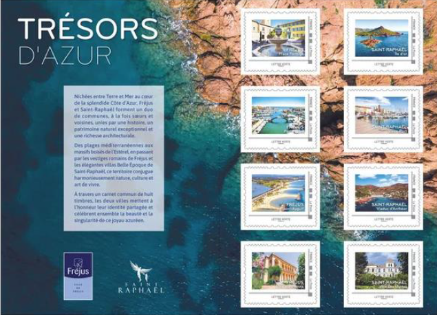 Ces 8 timbres autocollants (à validité permanente au tarif LV à destination de la France) mettent en valeur les plus beaux sites de Fréjus et Saint-Raphaël et célèbrent la beauté et la singularité de ce joyau azuréen.